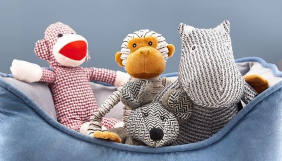 I've been buying these adorable little chirring monkeys for my friend's Pekingese since she was a puppy. She is not an aggressive dog, and falls asleep with her baby every night, and sucks on the fur while making kneading motions when she's resting. The chirring noise makes her so excited, so every year I buy her a new one when the voice box dies and she's started to wear a hole through the side.