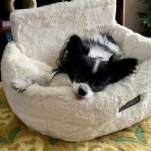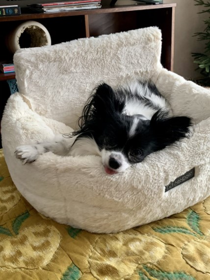 My dogs (10 lb papillon and 17 lb Japanese chin) are obsessed with this. We aren’t even using it as a car seat because as soon as I set it down in the house, the papillon jumped in and rolled around, claiming it. And he NEVER likes dog beds! I’m actually considering buying a second so they don’t have to fight over it. It’s incredibly soft and obviously cozy, judging by how they snuggle up in it! Four paws up.